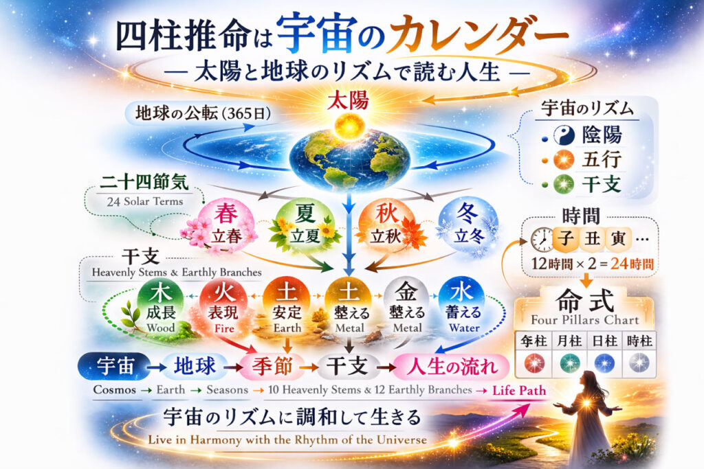 四柱推命は占いと思われることが多いですが、その仕組みは実は 宇宙のリズムと深く関係しています。